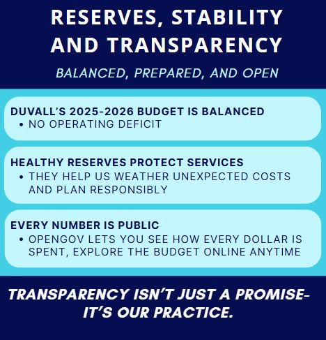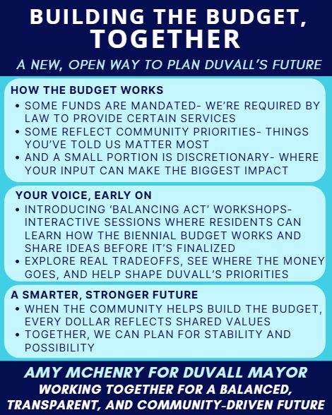 Campaign season can get heated, and sometimes people say things that don’t reflect the kind of community we want to build together. I’m choosing to stay focused on what matters — serving Duvall and leading with respect and transparency. I believe voters deserve campaigns based on ideas and solutions. This biennium’s (2025–2026) budget reflects our current community input and available resources. It’s flexible and designed to meet present needs while giving the next mayor and council full freedom to adjust priorities.